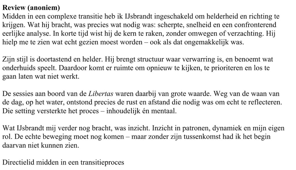 Ik heb met IJsbrandt samengewerkt tijdens een offshore zonneparkproject, waar hij als Installation Manager werd ingehuurd. Vanaf dag één had hij feilloos door waar onze organisatie vastliep. Zijn vermogen om snel te doorgronden hoe structuren, belangen en menselijke dynamieken een project maken (of breken) is indrukwekkend. Toen de uitvoering stil kwam te liggen door interne besluiteloosheid, verschoof zijn rol naar die van coach. In die periode heb ik ontzettend veel van hem geleerd. Zijn aanpak is stevig, gestoeld op theorie, ervaring en een oprechte fascinatie voor wat mensen drijft. Niet alle inzichten bleven direct hangen, maar de lessen die ik heb onthouden zijn blijvend waardevol.